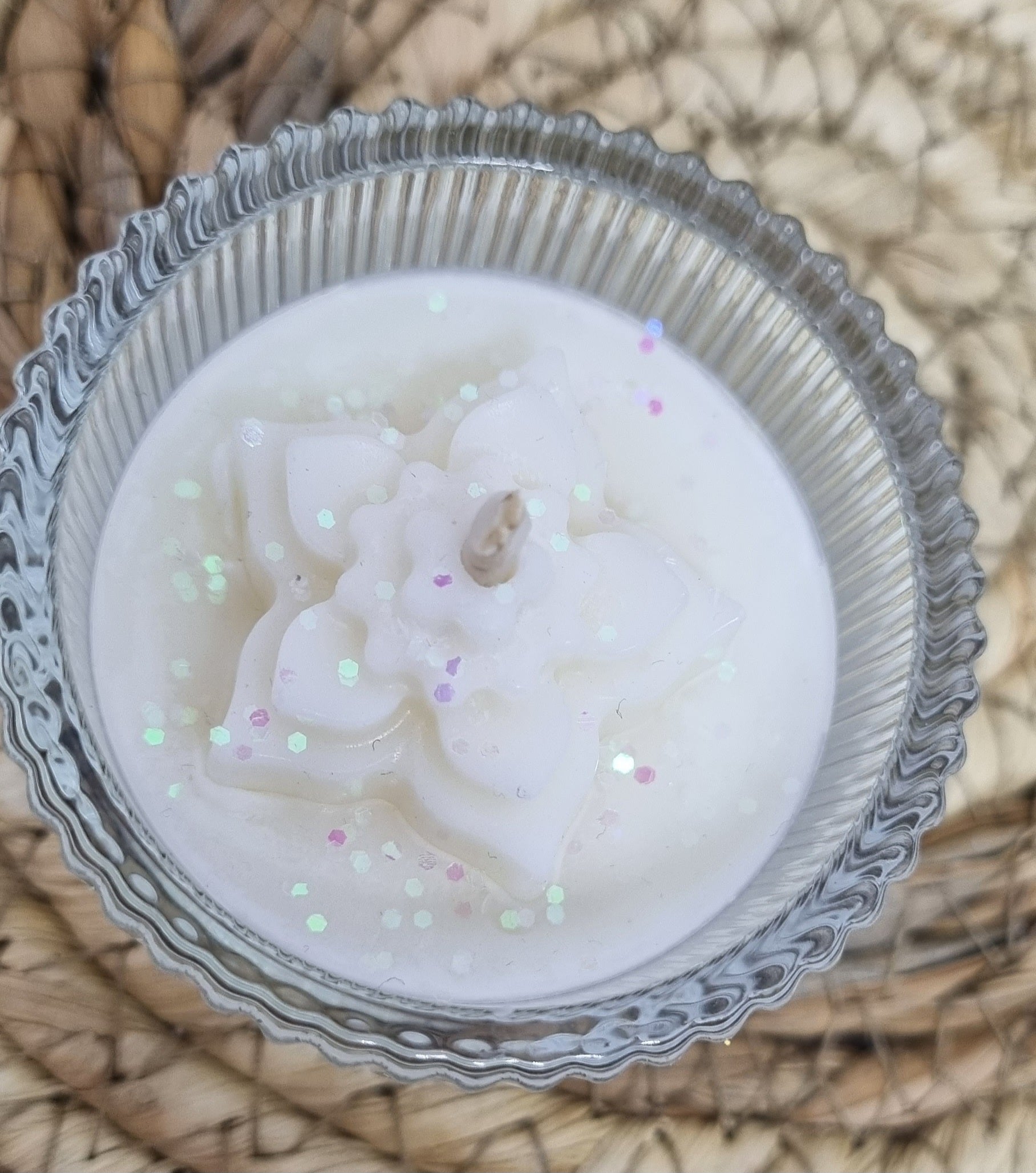 Jolie bougie avec sa petite fleur blanche, bougie non parfumée , idéale pour décorer vos tables lors de vos différents évènements.
