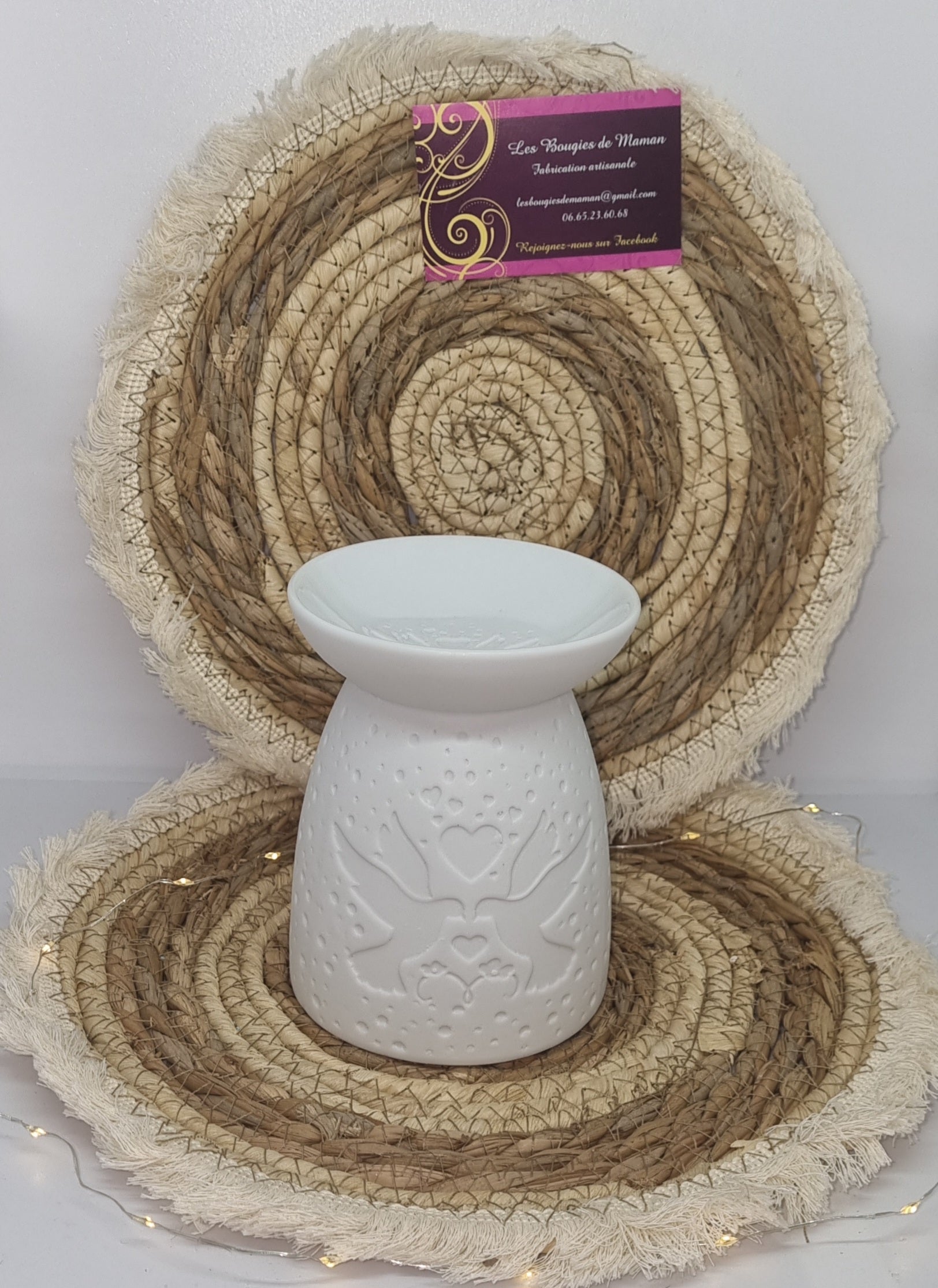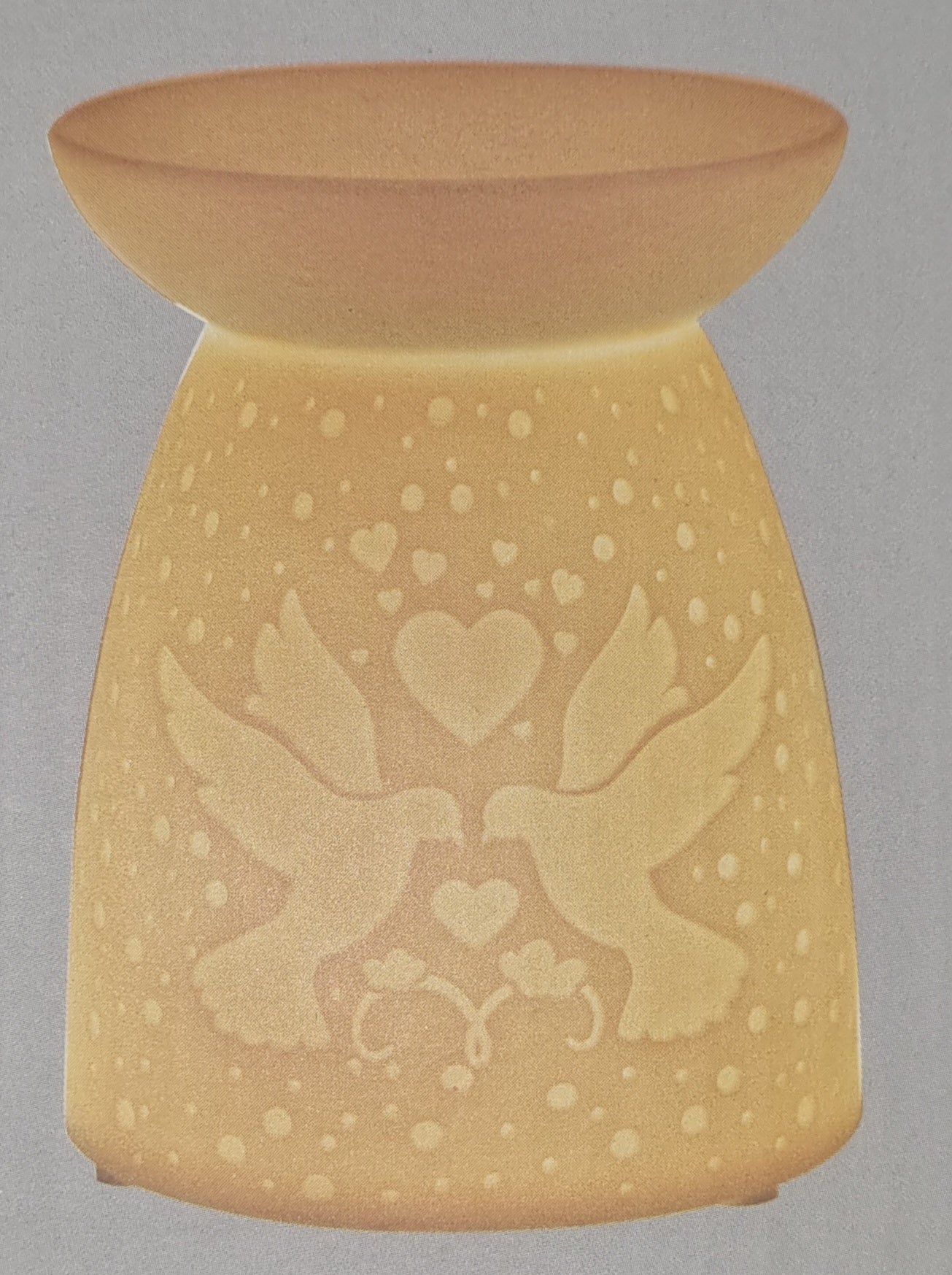 Ce beau brûleur en céramique blanche a un design délicat imprimé de 2 tourtereaux.